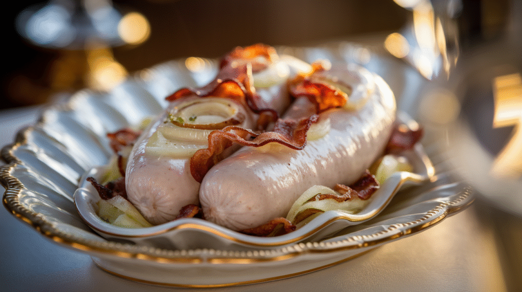 Salsicce bianche croccanti e succose, cotte al forno con cipolla caramellata e pancetta affumicata nella friggitrice ad aria: un pasto facile e ricco di sapore, pronto in meno di 30 minuti.